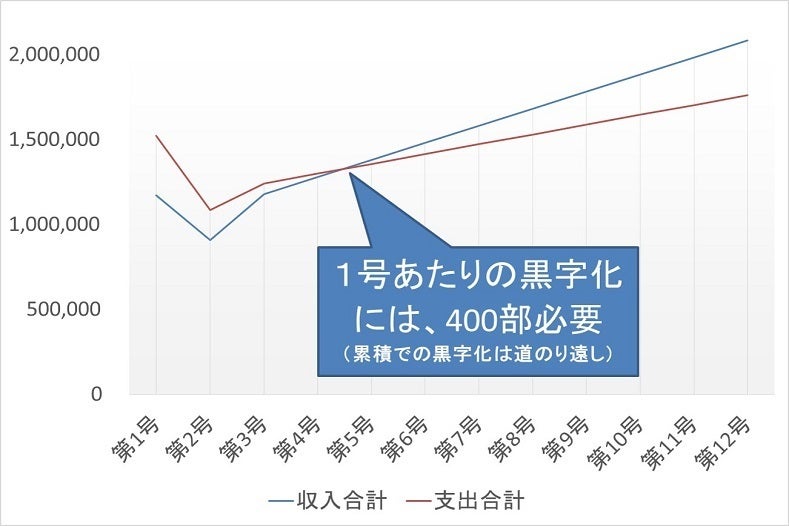 しかしながら、上のグラフのとおり、創刊号で150万、そして1号あたり400人の購読会員がいなければ黒字化できず、このサービスを継続することは困難です。