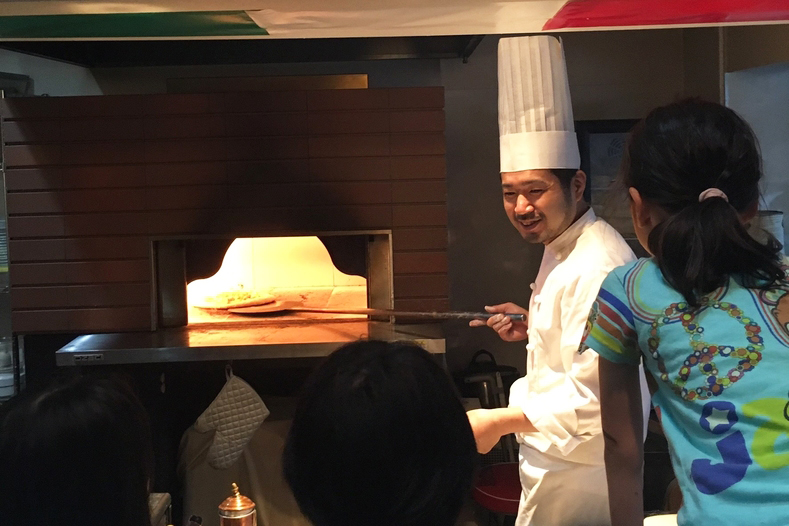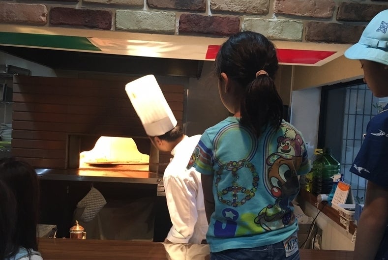 ピザを焼くところを真剣なまなざしで見ている。焼きあがると歓声も。