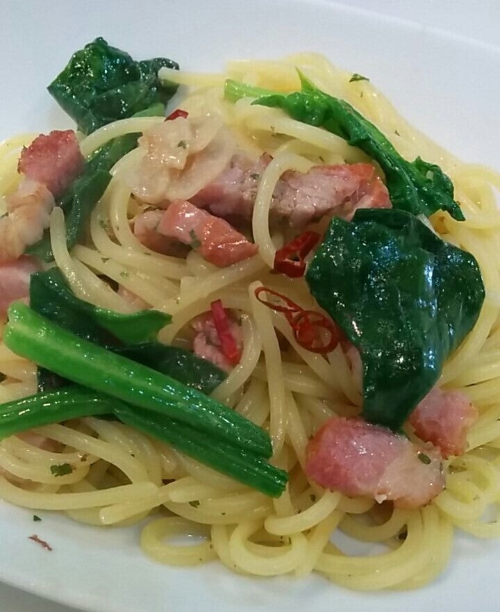●しっかり乳化させてます!ベーコンとほうれん草のペペロンチーノ¥900