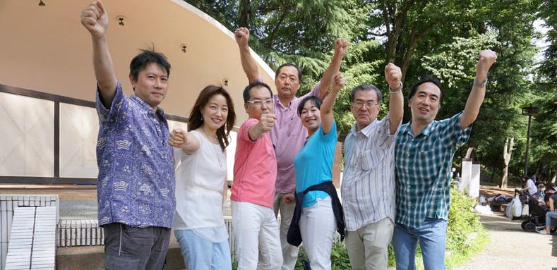 【写真】会場予定の井の頭公園野外ステージ前にてイベント開催に向けてやるぞー!オー!