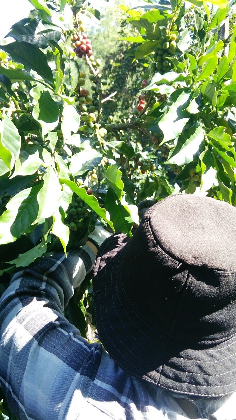 ▲ コーヒーの木からチェリー(コーヒーの実)を採取しているところ