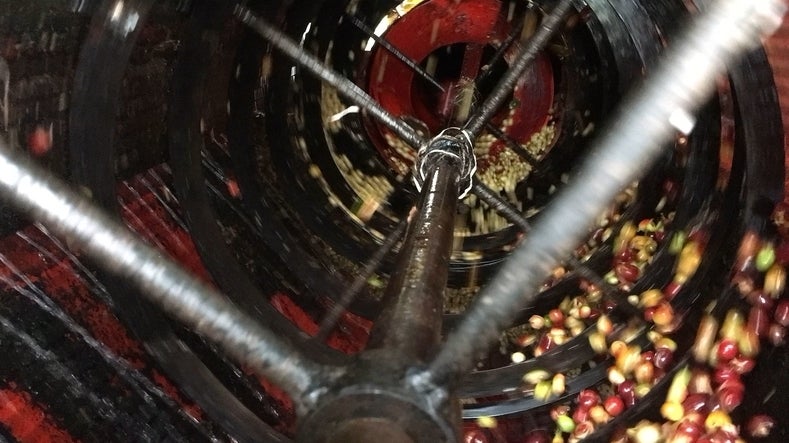 ▲ チェリーから実を取除いて種子だけにしている作業