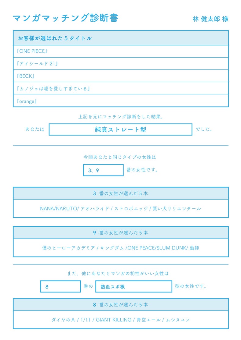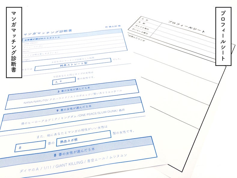 当日イベント開始前に結果をまとめた「マンガマッチング診断書」