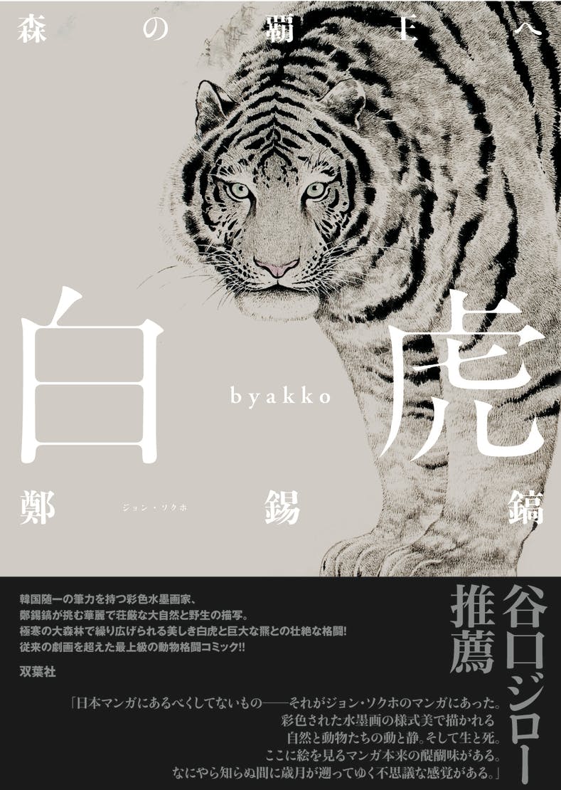 極寒の大森林で繰り広げられる美しき白虎と巨大な羆との壮絶な格闘を、従来の劇画よりも遥かに繊細な彩色水墨画で1コマ1コマすべてを描き、マンガの体裁で紡いだ世界初の作品です。四季折々の大自然の風光や、そこに棲む野生動物たちの姿も見所です。