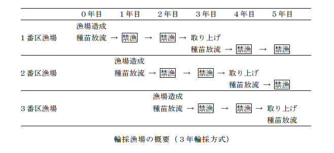 アワビの輪採漁場は3年輪採方式で、3箇所の漁場造成を行ってアワビ種苗を放流し、その後3年間 は禁漁し、1年に1箇所ずつ順番に取り上げを行う仕組みです。
