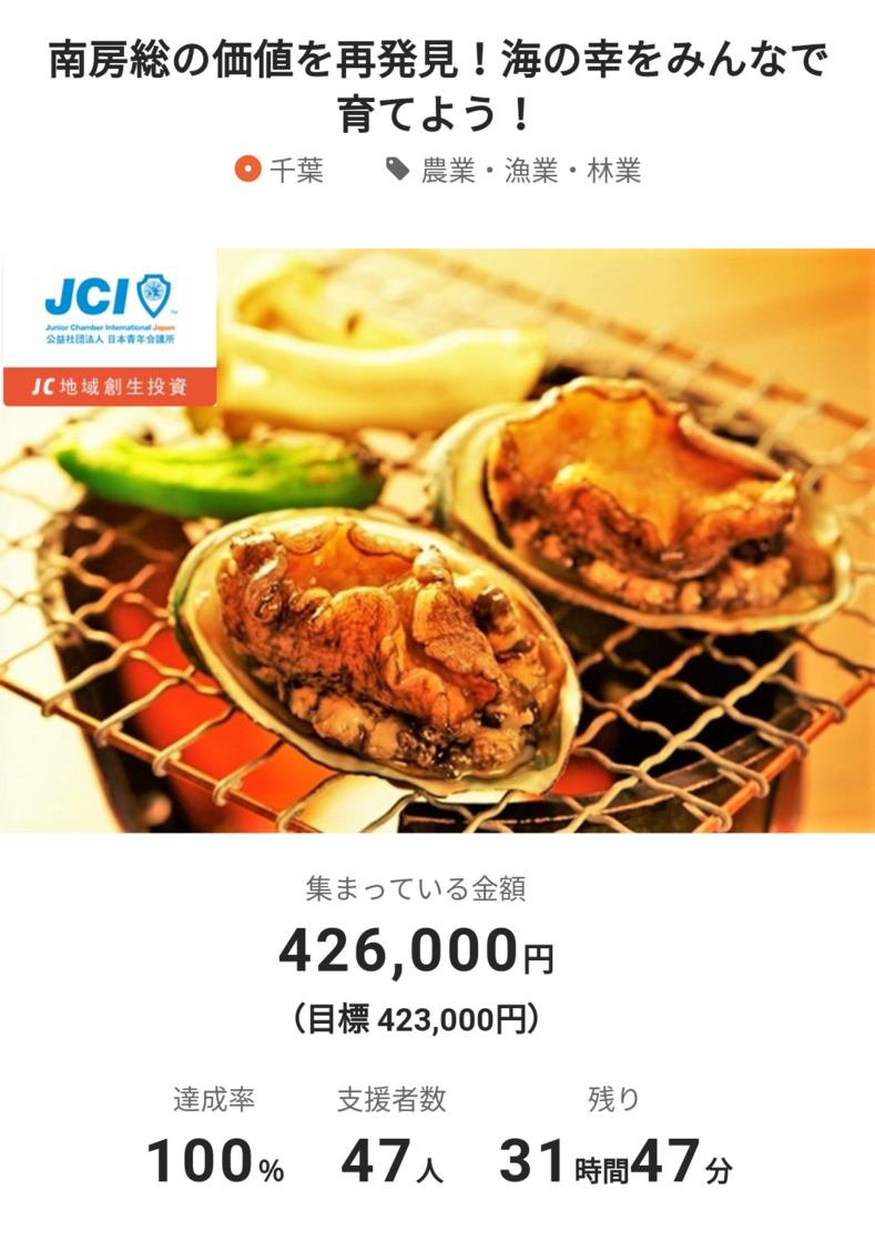 2016/11/08 13:31こんにちわ! 館山青年会議所です! 昨日、締め切り2日前で「南房総の価値を再発見!海の幸をみんなで育てよう!」プロジェクトの目標金額を達成できました! ご協力頂きました皆様、ありがとうございました! 嬉しい!!本当に嬉しいです!! 今回のプロジェクト、地域の伝統、産業、食、観光・・・などたくさんの分野にわたり、影響力のあるプロジェクトです。 多くの方にお声がけ頂き、協力して頂かなければ達成できなかった、このプロジェクト、これから先の未来に向けて、カタチを変えて受け継がれていってくれたらいいなーなんて思います。 さて、これからがホントの本番です! 達成できましたので、後日、稚貝を実際に放流します!! 放流の様子はご支援を頂いた皆様へ、メールで報告をさせて頂きます! また、100%達成できましたが、まだまだご支援いただければ、放流する稚貝を増やすことが出来ます! 「間に合わなかったー!」なんてことがないように、残り一日、ぜひご支援ください! 宜しくお願い致します! はやかわ もっと見る