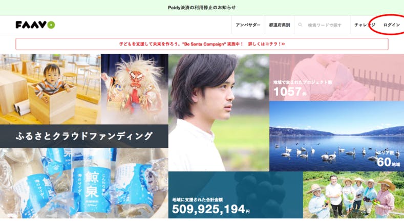 FAAVOでプロジェクトを支援する際には、まず会員登録をする必要があります。TOPページ、プロジェクトページどこからでも出来ます。右上の「ログイン」ボタンをクリックして下さい。