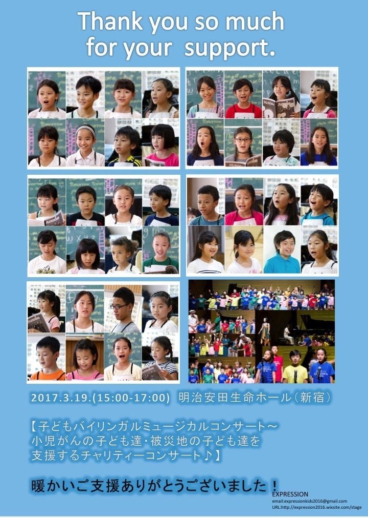 2017/03/29 20:012017・3・19(日)新宿明治安田生命ホールにて開催いたしました EXPRESSION主催 【子どもバイリンガルミュージカルコンサート~小児がんや難病と闘う子ども達・被災地の子ども達を支援するチャリティーコンサート】にご来場くださいました皆様 ありがとうございました。 EXPRESSIONの子ども達は初めてミュージカルナンバーの数々にチャレンジし、皆様から大きな声援を頂き、日々の練習の成果を全力で表現することが出来ました。 今も通院やリハビリを続けている高校生2名が歌とトランペットで私達の応援に駆け付けてくれました。『苦労に苦労を重ねて、彼らの今があります。抗がん剤や移植の苦しい治療を乗り越えた二人が病院以外の場所で しかも舞台で共演出来るなんて奇跡としか言いようがありません。』と保護者の方そして聖路加国際病院小児科医療スタッフの皆様からご報告い頂きました。EXPRESSIONの子ども達は参加してくれた高校生お二人から「一生懸命生きる」ということを教えてもらいました。 EXPRESSIONでは、明治安田生命ホールホワイエにてチャリティー物販ブースを設け、売り上げ金を募金箱に入れて頂きました。多くの皆様にご協力頂きまして、92,315円の寄付金を集めることが出来ました。クラウドファンディングを通じてのご支援や寄付金と合計いたしまし【190,315円】を、この度のコンサートの支援先であります認定NPO法人シャイン・オン・キッズ/認定NPO法人ジャパンプラットフォームに寄付させて頂きますことをご報告致します。 暖かいご支援とご協力を賜りました多くの皆様方に心より厚く御礼申し上げます。 (写真撮影:Midori S Inoue) **返礼品の発送、講座に関するご案内も終了いたしました。お問い合わせがあるかたはこちらまでお願いいたします。 expressionkids2016@gmail.com もっと見るコンサート前売りチケットいよいよ販売開始です!