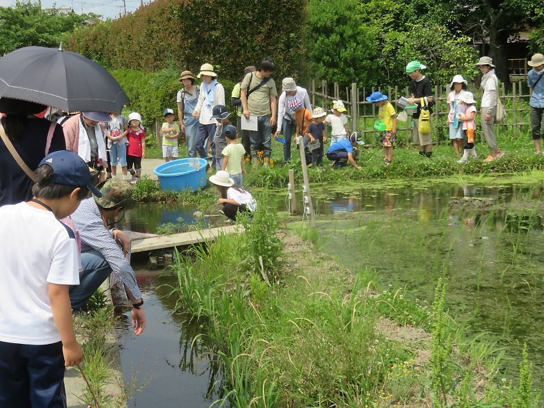 用水路には、ハグロトンボのヤゴ、ドジョウ、フナ、タモロコ、ヒメタニシ、ハイイロゲンゴロウの幼虫、コガムシ、アマガエルのオタマジャクシ、ヌマエビなど多くの生きものが見られました。