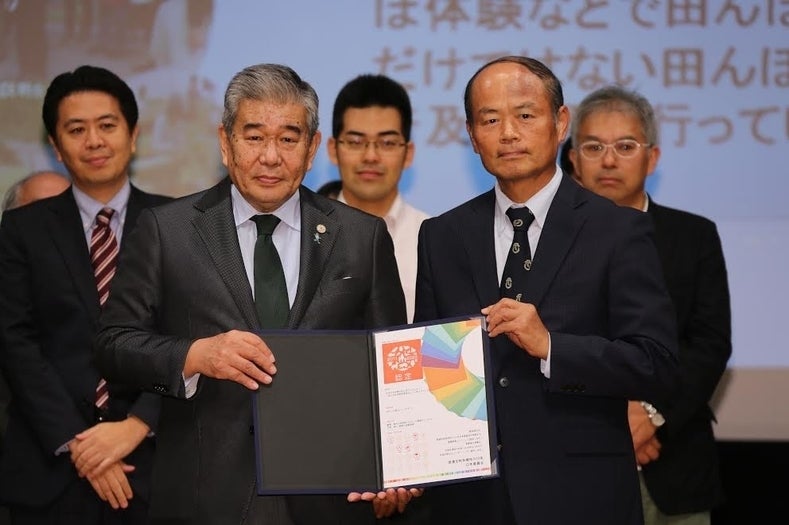 尚、「生きものを育む田んぼプロジェクト」は、昨年、UNDB-Jの認定事業になりますた。写真はその時の授賞式の模様です。右が代表理事の増田純一です。