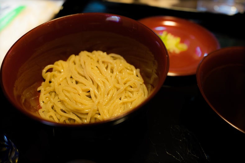 国産の無農薬小麦粉とミネラル豊富な全粒粉を使用。これらをブレンドし、かん水を使用せず、天然の重層を使って水まわし、一定の時間寝かせた後、足打ちで練り上げるので、「うまみとコシ」の強い麺が特徴。