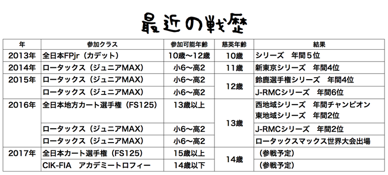 と思い、誰よりも練習し、中学1年生で鈴鹿で優勝することができました。「優勝したい」から「絶対優勝する!」に気持ちが変わり、何より自分の為だけじゃなく、応援や期待してくれる方々のために優勝する!という気持ちに変わりました。2016年はジュニアMAX日本代表になり、地方カート選手権西地域でチャンピオンをとることができました。ですが東地域は2位で史上初の東西両シリーズでのチャンピオンを逃してしまいました。自分のスキルが低かったり精神面が弱かったと思います。この悔しさを忘れずにさらに頑張っていきたいです。