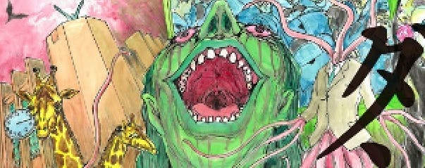 顔だ。巨大な女の顔だ。顎先から頭頂まで実に二メートル超はあるだろうか。それが会議室の奥にどんと鎮座している。無論、生首ではない。首のあたりを見ると床が円形にぶち抜かれている。おそらくは一階、二階を貫通して、この会議室に首だけ出しているのだろう。女——といったが、長い髪や睫毛などからそう判断しただけであって、その表情に女学生の可憐さなどは微塵もなく、とろんと濁った瞳はひん剥かれ、口はだらしなく開け放たれて際限なく床に涎を垂らしている。黒い毛髪もよじれ脂ぎり、べたりと頭皮に張り付いていた。洗顔という概念がないのだろうか。顔全体は垢により黒ずみ、不潔な異臭を放っている。この巨大な首が会議室全体の五分の一の空間を占めていた。(『ダンゲロス1969』より)