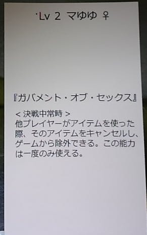 今回のゲームではLv2の魔人として登場。決戦フェイズにおいて、相手プレイヤーのアイテムを股間にしまい込んでゲームから除外する能力として再現しています。
