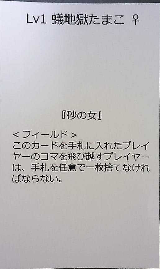 微妙に影の薄かった蟻地獄たまこだが、終盤になって猛威をふるった。みんなが旧校舎に向かっている時に、途中にこのカードを持ったプレイヤーがいると、飛び越えられず足踏みせざるを得ない。「ここで手札を失ったらボスに勝てない」状況だからだ。状況次第だが、蟻地獄はかなりの移動阻害効果を発揮できる。しかし、これを持っている本人も手札が一枚Lv1で埋まってしまうわけで、リスク・リターンの釣り合いは取れているのではないだろうか。