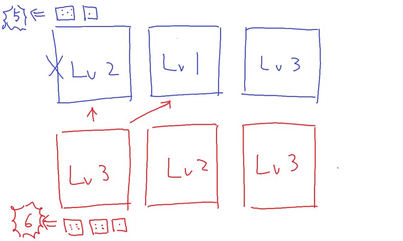 最大で3枚vs3枚の戦いとなります。Lvの数だけダイスが振れて、出た目の最大値が自分の攻撃力となります。最大値が大きい方が勝ち残り。