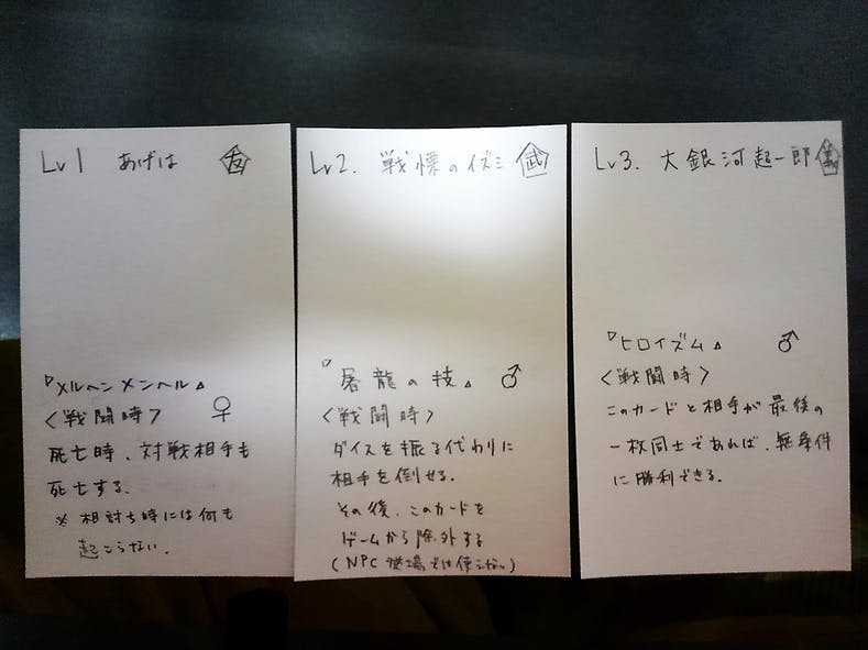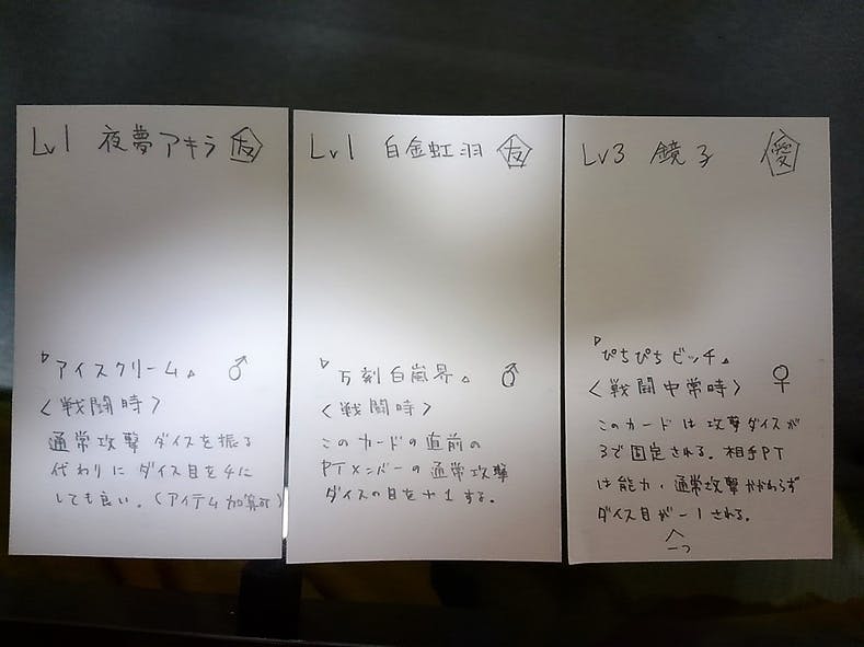 ・現状はこんな感じで名刺用印刷紙に手書きでカードを作ってテストプレイしています。