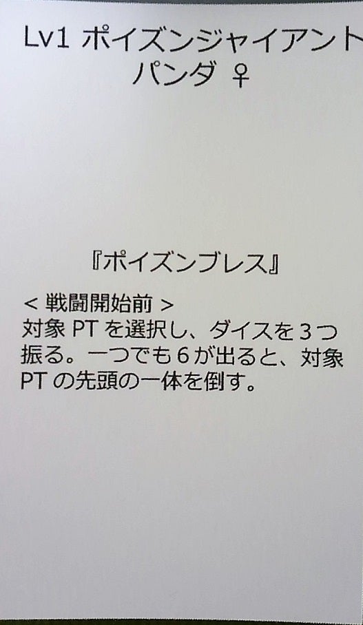 昨日、新宿「ニュータイプ」にて、3万円以上ご支援頂いた支援者さまとの第一回テストプレイを行ってきました。参加者は僕含め五名でした。 「今はテストプレイなので、つまんなかったらつまんないって遠慮なく言って下さい! むしろ言って頂いた方がお手元に届くゲームが面白くなりますので!!!」 とお伝えして始めたテストプレイですが、以下のようなご意見を頂きました。 ・「次に何をやればいいか」が分からなくて脳みそが大変なので、各プレイヤーの手元にフローをまとめたカードが一枚あると良いのでは? ⇛作る方向で検討。 ・見ている限りでは、AP(アクションポイント。ワーカーから改称)を設置するフェイズの処理が重いと感じた ⇛「実際やってみると楽しかった」とのことで現状問題なしと判断。 ・アイテム「エロ本」が決戦フェイズでは無意味なので、何か効果が欲しい ⇛戦闘でも使える効果を加える方向で調整。ただし、カードテキストが長くなるので、そことの兼ね合いか。 ・Lv1の敵は戦闘なしで仲間にしても良いのでは? 特に後半戦は負けることがほぼないので。 ⇛難しいところ。ゲームの高速化には寄与するが、戦わずに仲間にするのもよく分からない話。レベル差が開いていれば……というのはありかもしれない(Lv3がいればLv1は無条件で倒せるとか)。要検討。 ・魔人カードごとに「死亡」と「倒れた」の記述があり、違いがよく分からない。 ⇛単なる不統一なので修正します。 ・魔人カードごとに固定値が書いてあり、敵として出た場合は、その数字を超えれば勝利という形にすると、個性が出るし、敵のダイスを振らなくていいのでゲームがサクサクするのでは? ⇛要検討。アリかもしれないが、現状のとどちらが面白いかは分からない。一度試す価値はあるか? ・APを戦闘力に置く価値が高すぎるので、もっとシビアにして能力ゲーの要素を高めた方がいい。 ⇛現状、試験的にボス敵の戦闘力を上げて、APの戦闘力の上限枠を引き下げた。一戦した限りではこれでも十分にゲームになったが(そして面白くなった)、今後「ボスが強すぎて誰も倒せない」みたいな状況になるかもしれないので、もう少しテストプレイを続けて様子を見たい。 ・探索フェイズでもっと他プレイヤーの移動阻害できる能力が欲しい。 ⇛要検討。他プレイヤーの阻害はあまりやりすぎるとゲーム全体が重くなる。現状では「蟻地獄たまこ」「赤蝮伝斎」が実質的な移動阻害能力だが、これらを十分に使えていないことが原因かもしれないので、もう少し様子を見たい。 その他にも幾つかご意見を頂きました。ありがとうございます。 * 今回、「オヒョッ!?」っとなったキャラ。 プレイヤーの一人が、戦力強化をほぼせずにいきなりボスに挑んで、ポイズンジャイアントパンダの<戦闘開始前>効果を使い、「逃亡」で戦線離脱するというプレイングを行っていた。今回は成功しなかったが、「逃亡」システムが初めて戦術的に機能していた(今までシステムとしてあっても誰も逃亡しなかったので)。パンダの成功率は42%なので、単体ボス(森、教室、番長小屋など)を狙いに行くのは十分に「アリ」な戦術。この戦術を封じるかどうかは今後のテストプレイを通じて確認していきたいが、相当酷い事にならない限りは、このままで行きたい。パンダの存在意義もグッと上がったし。 微妙に影の薄かった蟻地獄たまこだが、終盤になって猛威をふるった。みんなが旧校舎に向かっている時に、途中にこのカードを持ったプレイヤーがいると、飛び越えられず足踏みせざるを得ない。「ここで手札を失ったらボスに勝てない」状況だからだ。状況次第だが、蟻地獄はかなりの移動阻害効果を発揮できる。しかし、これを持っている本人も手札が一枚Lv1で埋まってしまうわけで、リスク・リターンの釣り合いは取れているのではないだろうか。