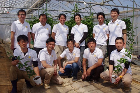 その後、栽培にチャレンジし、苗の販売をかねてパッションフルーツを栽培してくれる農家をさがしていきました。当初は、地域にあまり馴染みのない果実栽培の提案に対して反応は薄く、賛同を得るには苦労しました。しかし、石川君の情熱と提案が実を結び、徐々に若手農家が興味を示すようになり、現在では12名のメンバーが所属するまでに至りました。
