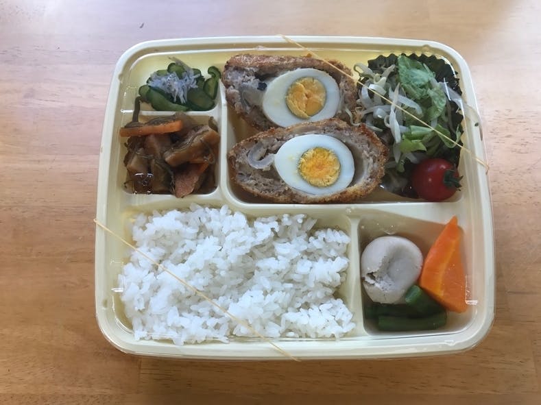 すずらんのある日のお弁当です! この日は ・スコッチエッグ 野菜添え ・切り昆布の煮物 ・野菜の煮物 ・しらす和え でした! このスコッチエッグはもちろん手作りです。 せっせとひき肉あんに卵を包む作業を100個以上! 味見をさせてもらいましたが、当然美味しかったです! この日のお弁当の主菜はスコッチエッグで少し洋風ですが 副菜に野菜をたっぷり使った慣れ親しんだ味の煮物など必ず取り入れています。 この日は切り昆布や野菜の煮物が入っています。 実際にお弁当を食べた利用者様にお話しを伺った所 「お野菜の煮物が美味しかった。 昔から食べているので、こういうのが好きです。」 「若い時に、お料理の仕事をしていたので食事には興味があります。 ここのお弁当美味しく頂いています。」 「今日も綺麗に全部食べました。」 と嬉しいお言葉を頂きました! エミコさんの 「お野菜をたくさん入ったお弁当をたくさん食べて健康になってほしい」 という思いをまさにお弁当箱に詰め込んで今日もお弁当を届けています! このプロジェクトも残り18日になりました。 まだこのレポートにのせていない配達場面なども たくさんアップしていきますので お楽しみに!!!!