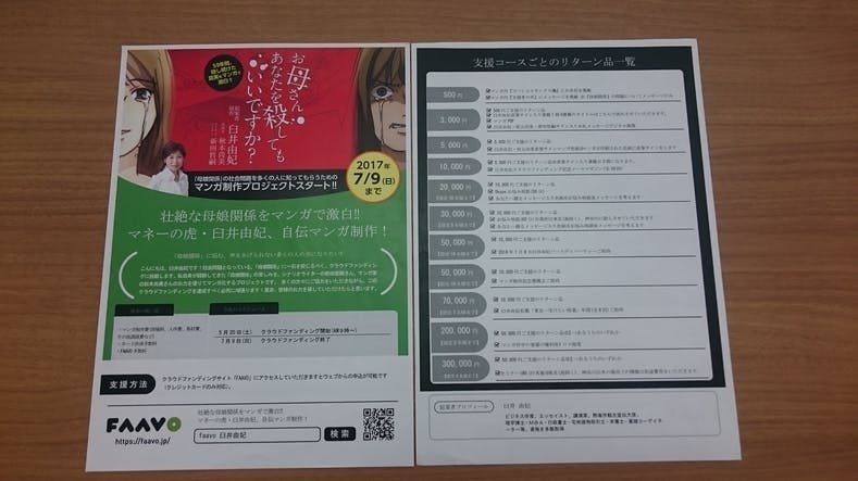 こんにちは、臼井由妃です! クラウドファンディングを始めてこれまで、感激の涙を流すことが何度もありました。 ご支援頂いた皆様のお気持ちに触れるたびに、プロジェクトを始めて本当に良かったと思います。改めまして、心から感謝致します。 今回ご紹介させていただくのは、ご支援を頂いたばかりか、プロジェクトの告知にもご尽力くださってる、創作料理「ゆうが沼津店」様です。 沼津駅南口から徒歩2分、駅より少し外れたところにある創作料理「ゆうが沼津店」はまさに「かくれ家」知る人ぞ知 る名店です。 地元沼津港からの新鮮な食材を五感で楽しめるお店http://www.yudai.co.jp/youga-yudai/numazu_page として、地元の方はもちろん観光客にも人気です。 こちらの店長、今泉弘さんとは以前から仲良くさせていだいており クラウドファンディングを始める前に、ご相談をしました。 「私を嫌いにならないでね」と、こわごわプロジェクトの趣旨を打ち明けたのです。 そして今……なんとお店の入り口とトイレにプロジェクトのパンフレットをはってくださっています。 お店の目立つところチラシを貼っていただきとても嬉しいです ありがとうございます‼ そんな温かいお気持ちと美味しい料理が自慢の今泉さんから応援メッセージをいただいていますのでご紹介いたします‼ 今泉弘さん 「臼井先生の著作のファンだったのですが、まさか先生がこんな壮絶な経験をされていたとは! 今回のプロジェクトで救われる人も大勢いるかと思います。応援しています!」 今泉さん、ありがとうございます! また、お店にお邪魔します。 ーーーーーーーーーーーーーーーーーーーーーーーーーーーーーーーーーーーーーーーー 6月4日7時時点で目標金額1000,000円に到達しました!! ご支援いただいた皆様、誠にありがとうございます。 プロジェクトはまだ、7月9日まで続いていきます。 そこでさらなるステップアップ!ストレッチゴールを設定しました! 150%達成の際には、プロローグだけではなく 『お母さん、あなたを殺してもいいですか?』の第二章制作もします! ※ストレッチゴールとは、プロジェクトの目標をさらに充実させる為に設定する、第2、第3の目標のことです。 どうぞ宜しくお願いします。