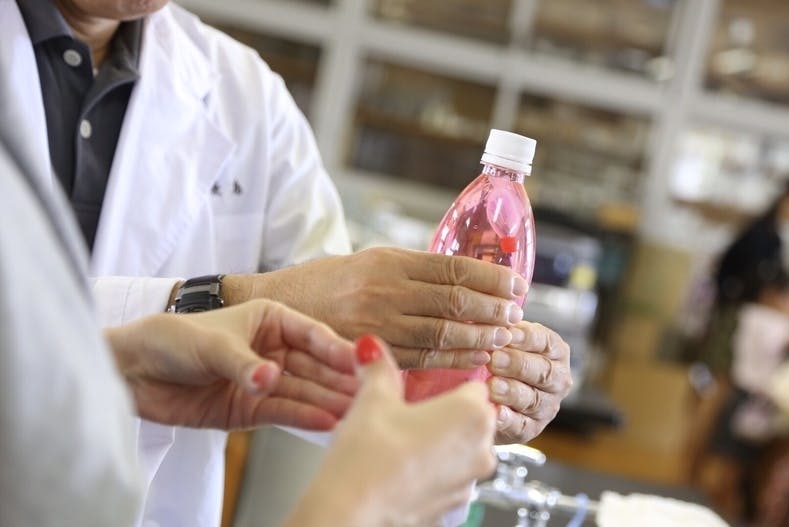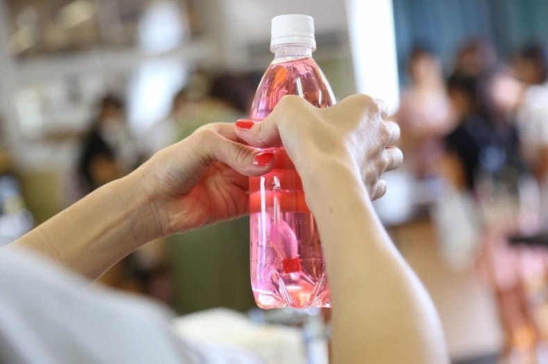 浮沈子(ふちんし)という、ペットボトルの中のお魚が、ペットボトルをグッと押すと下に沈んでいくというもの・・・のはずが上手くできない編集部。