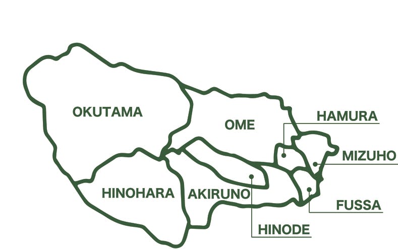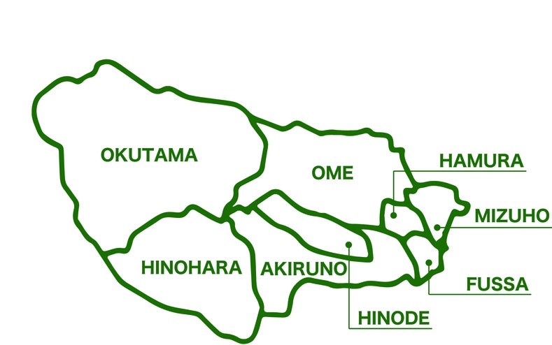 青梅市、あきる野市、福生市、羽村市、瑞穂町、日の出町、奥多摩町、檜原村からなる4市3町1村の西多摩エリア。