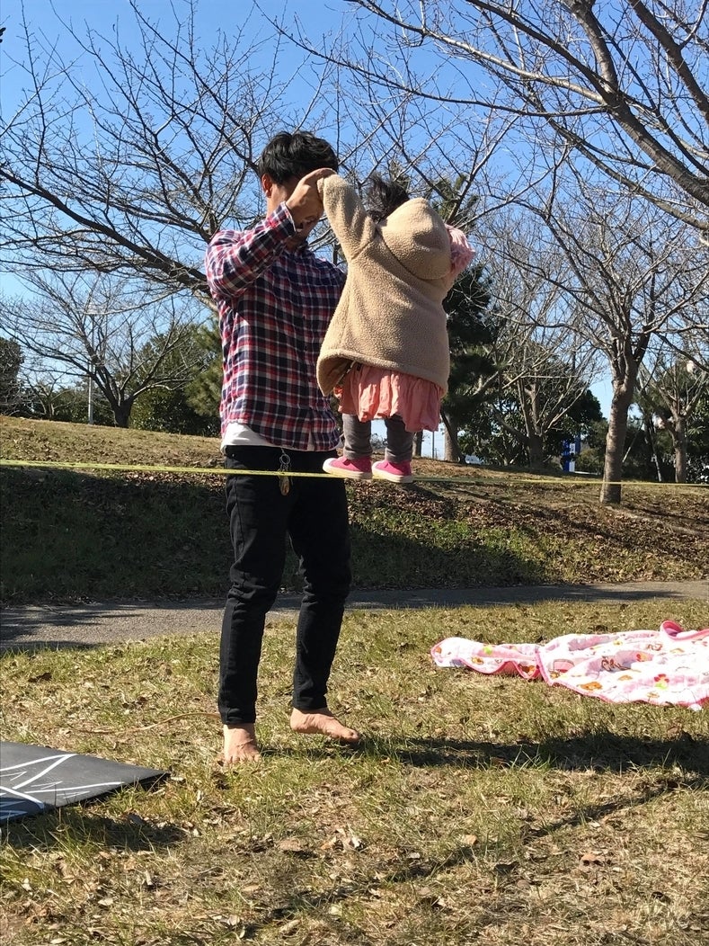 落ちて泣いてる子を抱いてなだめ、励まし、褒める。そんな事が多々あり家族のコミュニケーションの1つとなっているのが、スラックラインです。