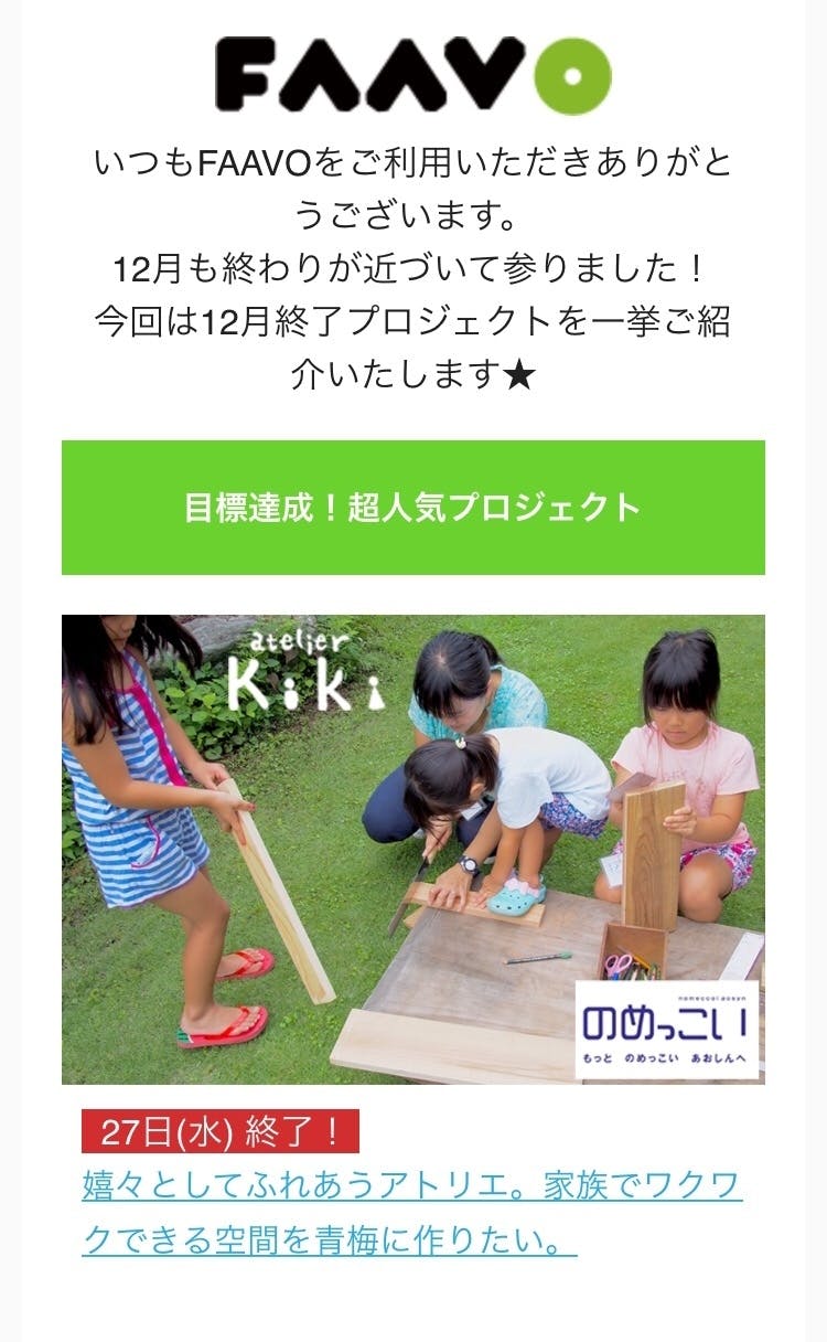 FAAVOさんのニュースレターにて【目標達成!超人気プロジェクト】に選んで頂きました!!