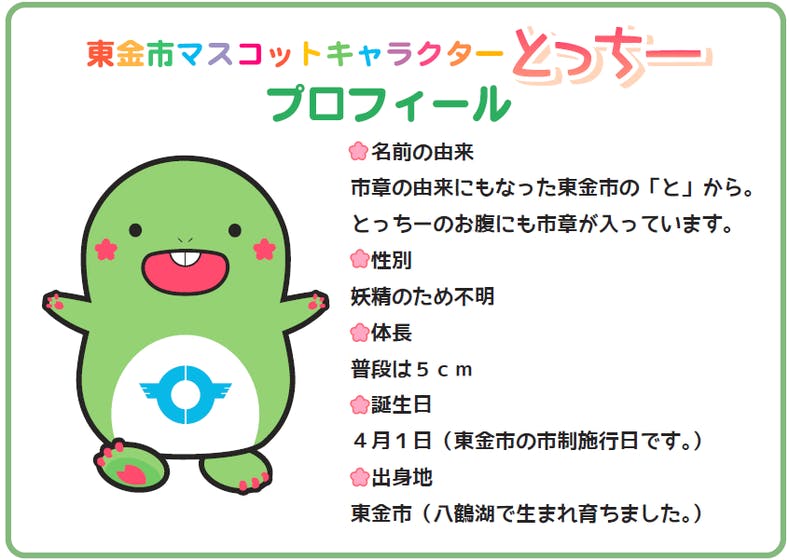 とっちーは、東金市の桜の名所「八鶴湖(はっかくこ)」で生まれ育ったため、桜の花が大好きです。とっちーの頬っぺたや手足、しっぽにも桜の花びらがついています。