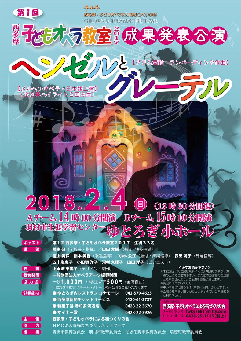 2018/02/05 13:37第1回 西多摩・子どもオペラ教室 2017 成果発表公演が幕を閉じました 昨日、2月4日(日)に行われました成果発表公演は、参加生徒33名が約半年間に渡る授業にて声楽的な発声と、バレエの身体表現と、基礎的な演技指導を経て、オペラデビューを果たすことができました! Aチーム 1幕より 本番終了後の修了式では、学校長より卒業生全員に修了証書を手渡し、その一人一人の表情を見る限り、二日間に渡る場当たり、通し、HP、GP、そして本番と言うハードスケジュールを見事にこなした充実感に満ち溢れていることを、その表情から感じ取ることができました。 Bチーム 2幕より 大変おせわになりましたこちらのフォームでは、目標金額には届かなかったものの、70%・77名の多くの方々にこの運動のご支援ご協力を賜り、心より深く感謝御礼申し上げます。 今後ともこの運動の細く永いご支援ご協力のほど、何卒宜しくお願い申し上げます。 Aチーム 3幕より 此の度は、誠にありがとうございました。 西多摩・子どもオペラによる街づくりの会 一同 もっと見る【2月4日 成果発表公演までいよいよ3日】
