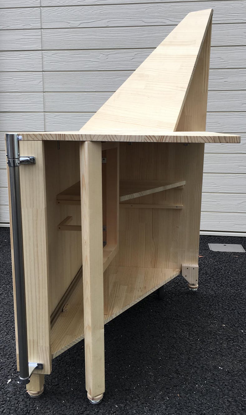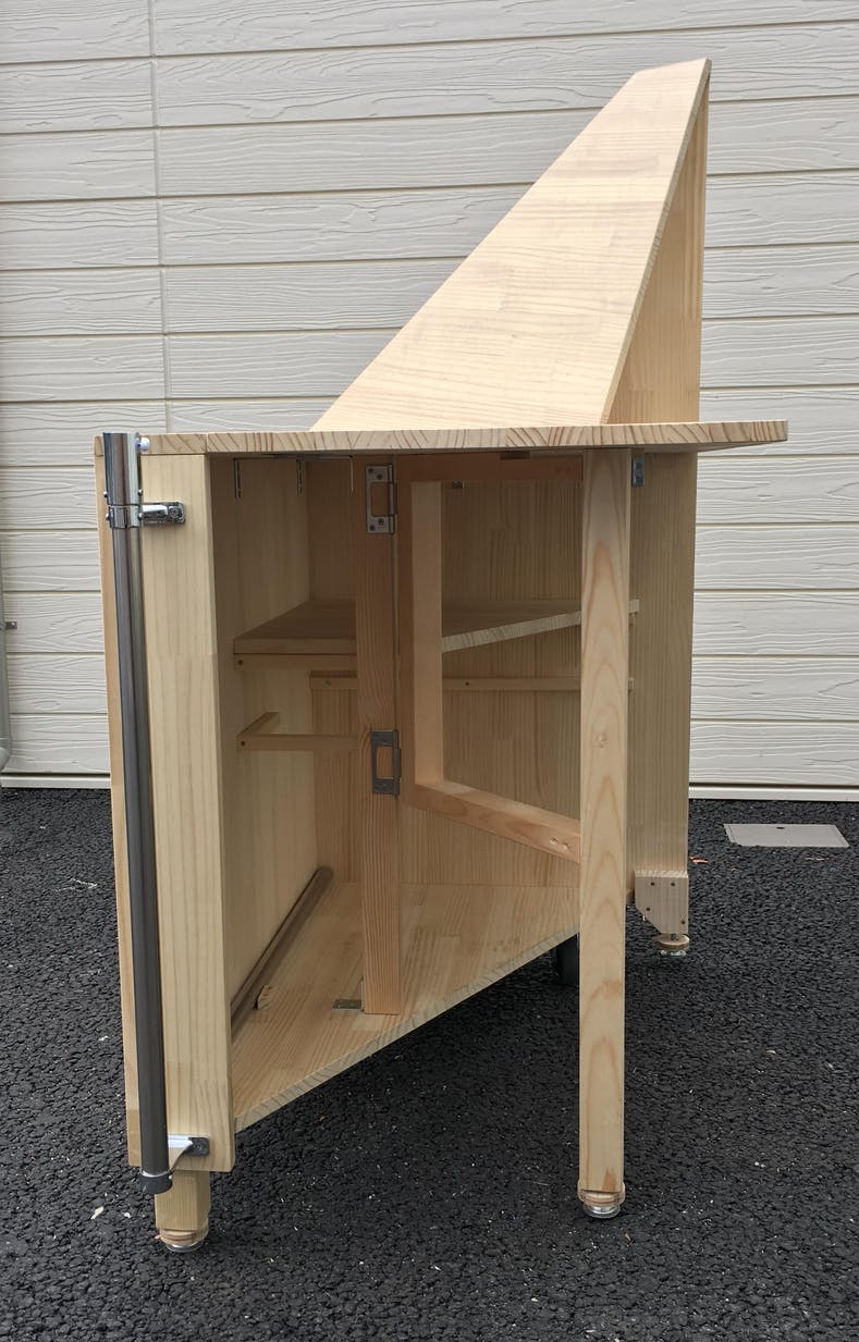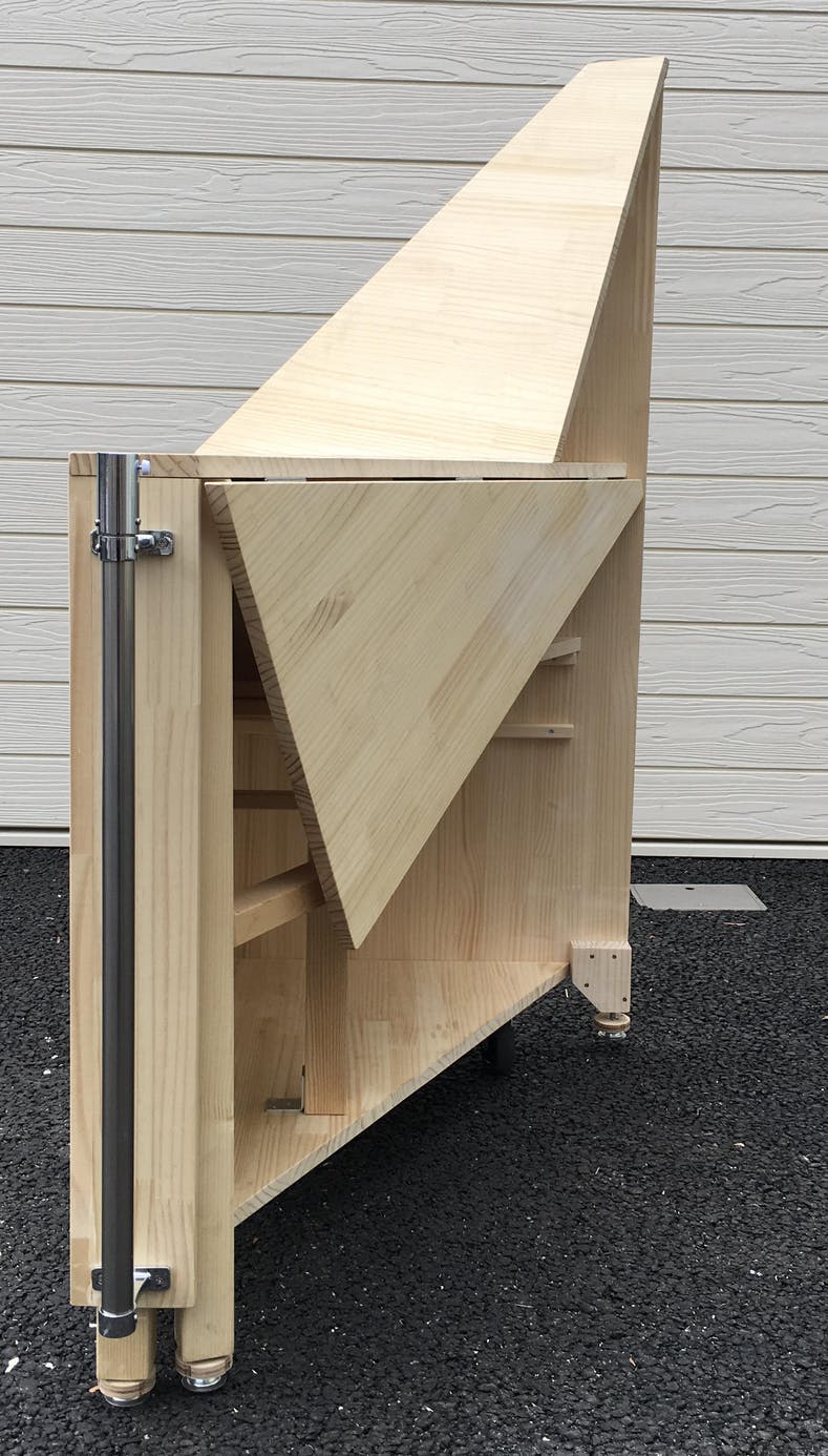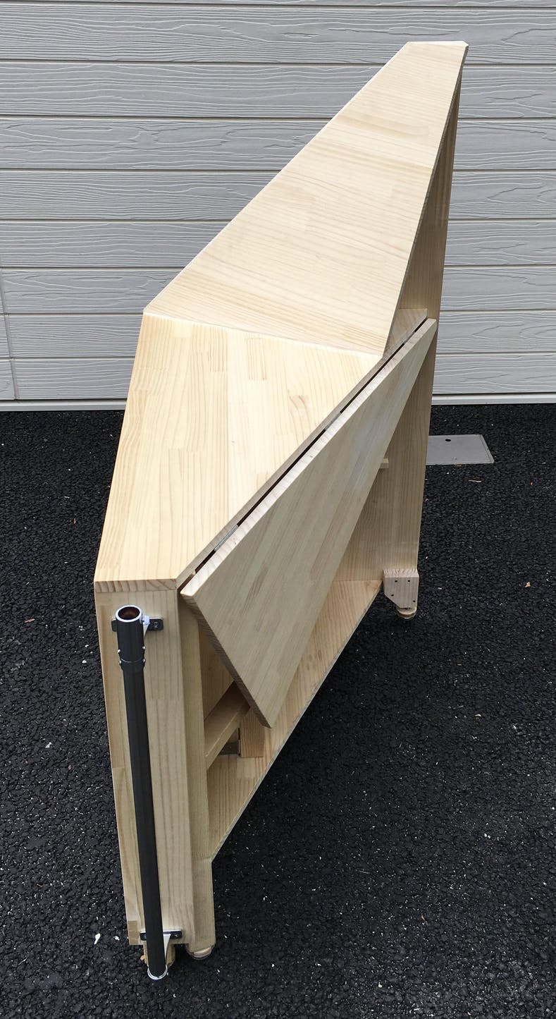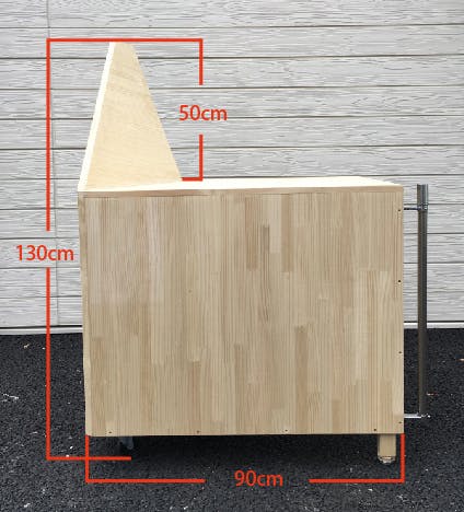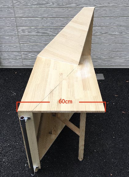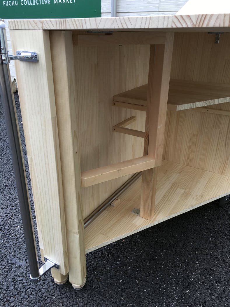 横から 天板の奥行きは60cm。一人で商品を広げて販売する分には十分な広さになっていると思います。