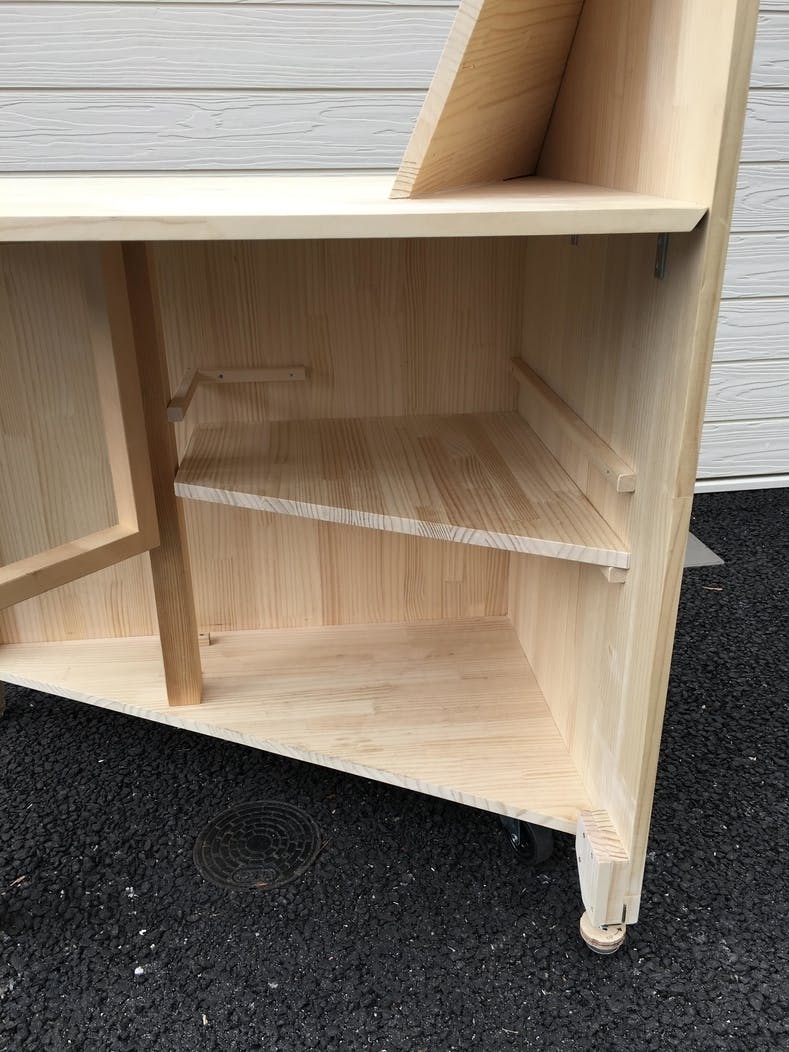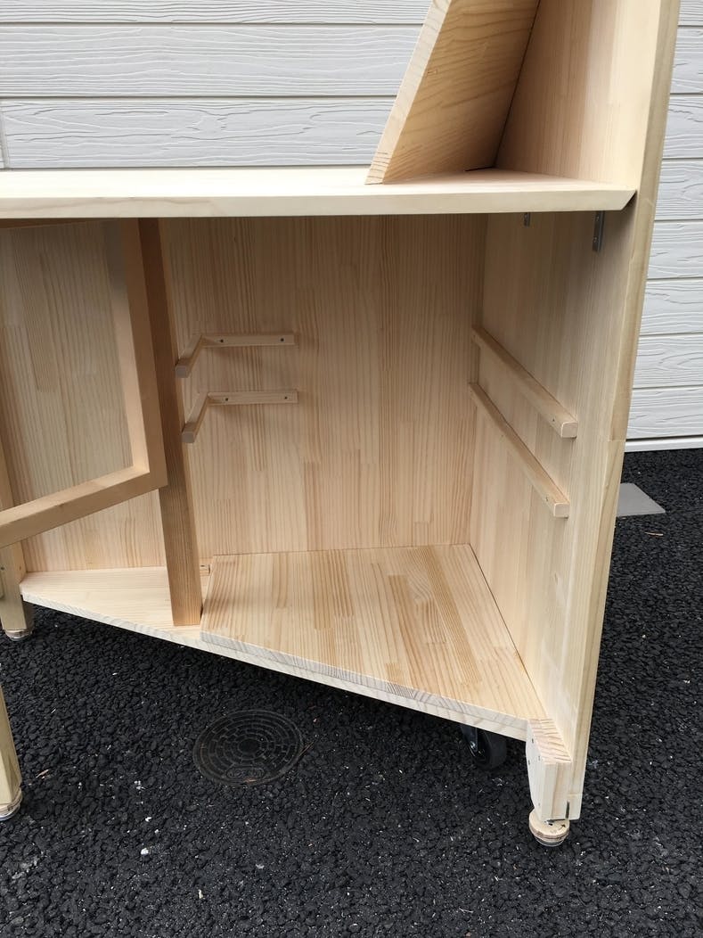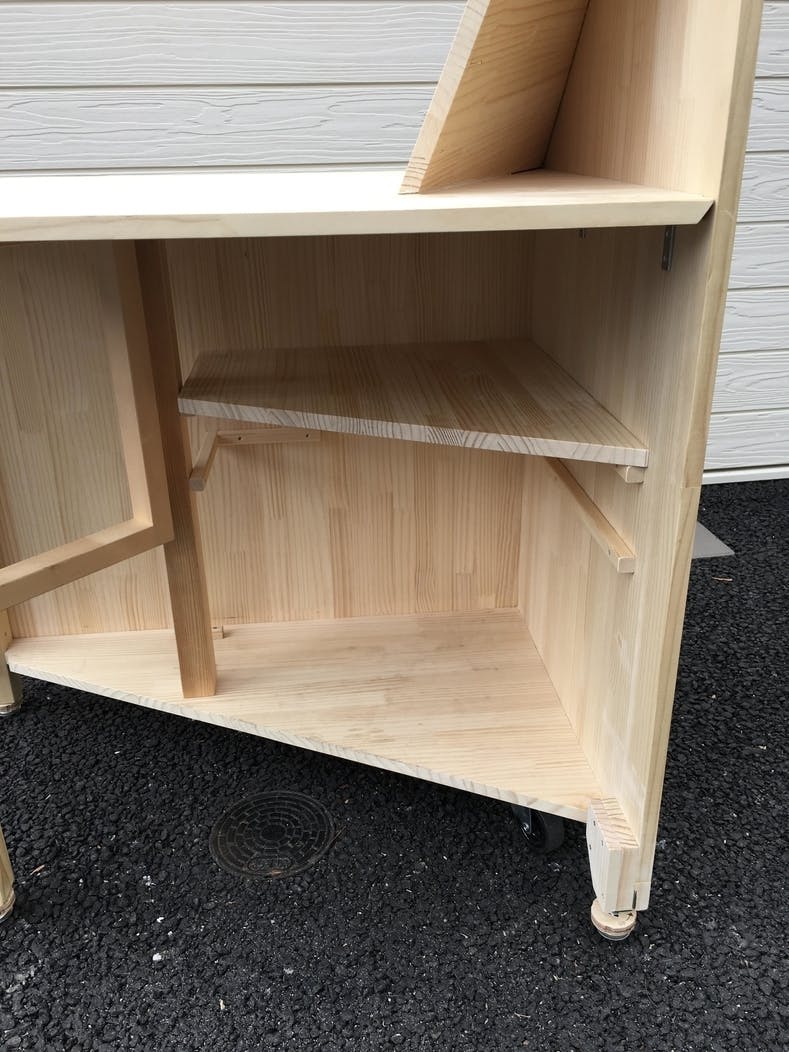 売り子側の天板の下は収納になっていて、在庫や商品に合わせて棚板の位置を変えることが出来ます。