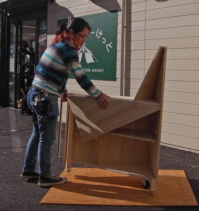 彫刻家の馬塲稔郎です。とんがりワゴンの各部の仕様をご説明いたします。正面からのサイズは、とんがりを含めた高さが130cm、天板の高さが80cm、横幅は90cmです。横から 天板の奥行きは60cm。一人で商品を広げて販売する分には十分な広さになっていると思います。特徴であるとんがりを売り子のほうから見ると、お客さまからは手元が目隠しになって、ものを置くことが可能です。売り子側の天板の下は収納になっていて、在庫や商品に合わせて棚板の位置を変えることが出来ます。〈上段〉〈中段〉〈下段〉また、とんがりワゴンは天板を折り畳むことが出来ます。脚をスライドさせ・・・ 脚を収納したのち、天板を折り畳みます。天板を折り畳んだ後は大分コンパクトな印象です。片側に車輪が付いていますので、このように持ち上げて移動がスムーズに出来ます。基本部材は暖かみのあるパイン材を使用。無塗装なので、お好きな色を塗ったりしてカスタマイズされてもいいですね。取っ手部分には強度が必要なため、ステンレスのパイプを使用。車輪が二つに、高さ調整用のアジャスターがついた脚が3つです。以上簡単ですが、各部の仕様のご説明でした。現在、試作屋台は「ふちゅこまーけっと」さんでモニターしていただいています。 実際の試作屋台を見たい方は ふちゅこまーけっと 場所 所在地:東京都府中市宮西町 2-2-12 でご覧いただけます!