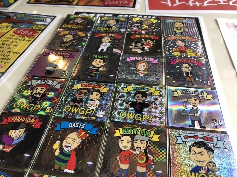 また、より多くの店舗を知ってもらえるようスタンプカードを作り、スタンプを集めると店主のビックリマン風シールが貰えるという、お客様にも楽しんで頂ける企画になっています。今まで行ったことのない店舗を知ってもらうきっかけになればと思っています。