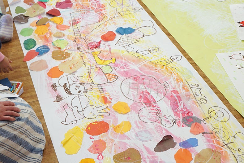 たちまち、床一面に個性が生きるのびのびした色や線が広がりました。