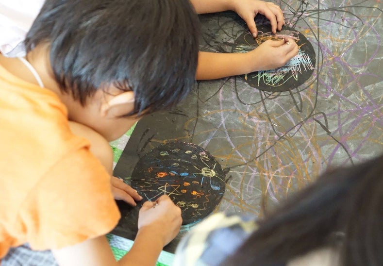 造形ワークショップとは創作活動の中で気づきや発見、たくさんの学びを得られるようにデザインされた遊びのプログラム。その日初めて出会う子どもたちや作家がスムーズに参加し、楽しく遊べるように"ファシリテーター"が誘導するため、絵が得意な子はもちろん、絵が苦手が子でも楽しめます。