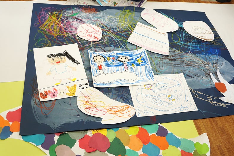 たちまち、床一面に個性が生きるのびのびした色や線が広がりました。