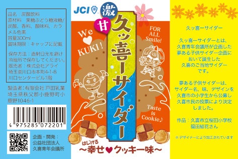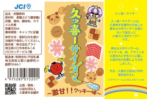 久喜にちなんだ、クッキー味、クッキーサイダーという商品名で、デザインは、クッキーを中心に、久喜市の名物、キャラクターを用いた、楽しく、可愛いデザインです。