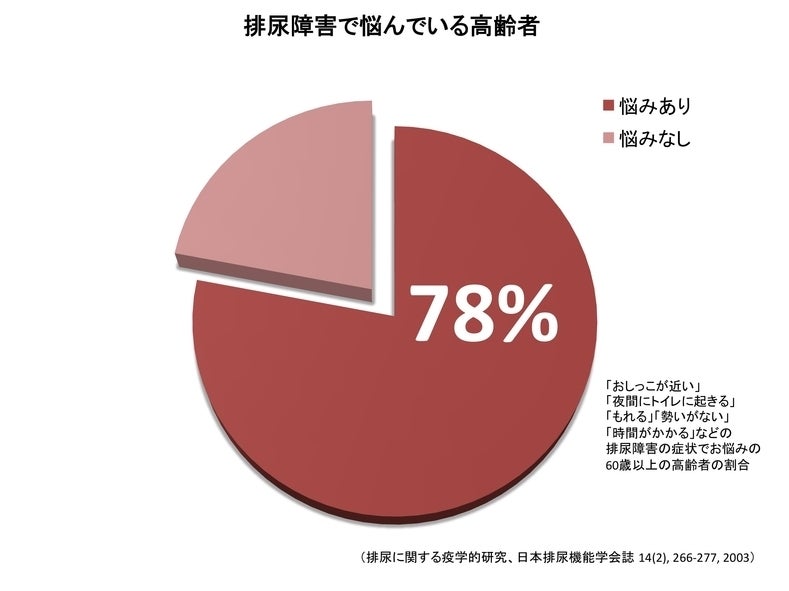 実は、「おしっこが近い」「夜間にトイレに起きる」「もれる」「勢いがない」「時間がかかる」など、トイレの問題(排尿障害と医学的には呼びます)で悩んでいる人が、たくさんいらっしゃるのです。日本排尿機能学会の調査によると、夜間頻尿がある人は4,500万人、昼間頻尿は3,300万人、おしっこに勢いがない人は1,700万人、おしっこがもれる人は1,000万人います。いずれの症状も年をとるにしたがって増え、60歳以上では78%が何らかの排尿の問題を抱えていることが報告されています(排尿に関する疫学的研究、日本排尿機能学会誌 14(2), 266-277, 2003)