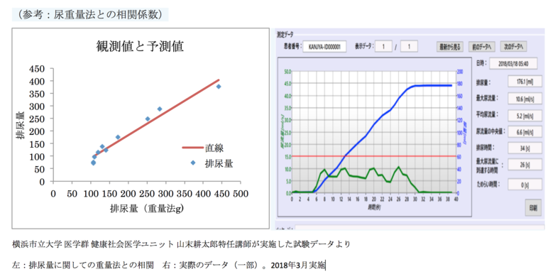Freeflow®による排尿量の検査結果と、尿重量検査の相関係数は0.98となり、十分な精度であることが確認されています。試験された横浜市立大学医学群 健康社会医学ユニットの山末耕太郎特任講師は「尿流量検査は病院で1回検査しただけではまったくわからず、自宅で数日間行ってよくわかるということです。自宅でも昼間の食事、水分のとり方、運動等で私の夜間の特性がかなり違うことがわかりました。Freeflow®は在宅で使用できることで、大きなメリットがあると思います。」と述べています。