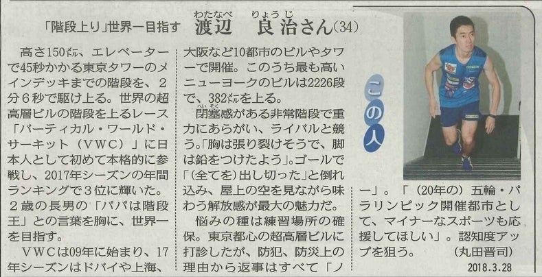 私は昨年、階段垂直マラソンという階段を駆け上る速さを競う競技のワールドシリーズ、「バーティカル・ワールド・サーキット(VWC)」に挑戦し、アジア勢として初めて世界3位の成績を収めることが出来ました。
