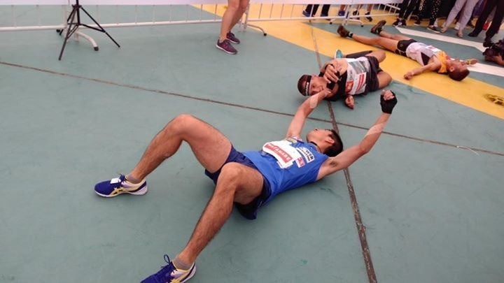 (北京大会で初めて表彰台を掴み、すべてを出し切って倒れこむ最高の瞬間)