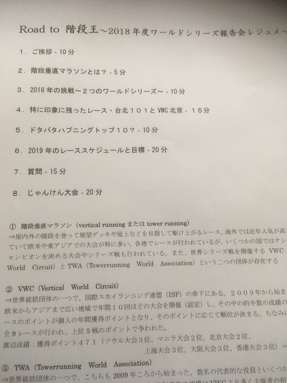 2018/12/31 08:20こんにちは。 階段王になる男、渡辺良治です。 お届けするのがものすごく遅くなってしまい大変申し訳ありません。今年の海外遠征の最終戦であるVWC香港大会のレポートをお届けしたいと思います。 今回の大会、正式名称は「SHKP Vertical Run for Charity: Race to Hong Kong ICC」です。 +364m、ステップ数は2120段で100階の展望室がゴールです。 5月のソウル大会から始まったVWCのの最終戦となり、獲得ポイントが1.5倍となるため毎回強豪が勢ぞろいする大会で今年も多くの上位ランカーが集まってきました。 とは言っても自分が警戒するのはピーターとマークです。 今年はVWCで全勝しているピーターは昨年の途中棄権のリベンジに燃えているし、マークはこの大会の3連覇がかかっているし、シリーズチャンピオンの可能性も0ではないので俄然狙ってきます。 そんな大事な大事なレースでしたが、まさかの寝坊によりあやうく電車に乗り遅れそうになり、最後までドタバタした海外遠征でした(笑) それでも今回はいつもの立石さんだけでなく、ハルカススカイランで男女日本人トップだった加藤さんと木下さんの四人の日本人選手たちでワイワイとリラックスした雰囲気ですごせました。 それでもやはりスタート直前になると一気に空気が張り詰めるのが分かります。 今回のレースプランは、大阪での終盤大失速の苦い経験を踏まえ、スタート直後に先頭を取るであろうピーターの後ろに一旦ついたのち、マークの少し前をキープして後半良い感じに上げていく・・・というものでした。 これならピーターが絶好調で追いつけなくてもマークに勝つ事が出来るはず!そう期待してスタートラインに立ちました。 そしていよいよ号砲!ピーター、マーク、自分が横一列に飛び出します。スタートして40mほどフロアを走ってから階段に突入するのですが、ここまでの位置取りが超重要なのはいつもと変わりありません。わずかに隣のマークよりも前に出た様にも感じたのですが、インコースとアウトコースの差で惜しくもマークに先行を許し、3番手で階段に突入しました。 残念ながら作戦は失敗でした。仕方なく前を行くマークから離されない様についていき、ラストスパートで抜き去り2位を目指す作戦に変更しました。 そして今回の階段は左回りのスクエア型。少し登っては踊り場がありまた少し登っては踊り場…というふうにとにかくちょこちょこと曲がります。一週間前の上海タワーでは九十九折で曲がっていたのとテンポが違うのでどうもやりにくく感じました。 「うーん、手すりを離して走るか?それとも片手で掴みながら走る?それとも両手で掴んで早歩き?」 登り方がイマイチ定まらず余計なことに頭を使ってしまったのか50階あたりから徐々に前の二人から離されていっているのが自分でもわかりました。これはマズイとペースアップを図ろうにもまだ先は50階ほどあり、潰れる心配が先に立ち結局現状維持を選択。 そうするとあっという間に前も後ろもいない一人旅状態になってしまいました。 正直ここからはとにかく早く終わって欲しい、長いシーズンの苦しみから解放されたいという思いで頭がいっぱいになってしまい、集中力がきれてしまいました。フォームも手すりを両手で掴み引き上げるだけで腰が落ちて胸も閉じて呼吸がドンドン苦しくなってしまい前を追う気力がしぼんでいきます…。それでもいつ後ろから誰か追い上げてくるかもしれない恐怖と闘いながらとにかく上へ上へと進んでいきます。 ようやく80階に到達し、最終盤にさしかかりました。もう後は出し尽くさないといけない場面です。「こんな不甲斐ない走りじゃダメだ!頑張れ!」と必死で自分を鼓舞しようとしますが、本当に苦しくて苦しくて・・・。 思った様にはペースアップは出来ませんでしたが、とにかく激落ちだけはしないでゴールにたどり着くことが出来ました。 いやー、本当に長かったです。今回のレースも今シーズンも…。5月の頭から7か月以上続いた海外遠征盛りだくさんの一年が終わったんだと思うとゴール後はしばらく放心状態で何も考えられませんでした。まぁ心臓も足も限界に達していてきつ過ぎて目も開けられないくらいきついので当然考える余裕なんて元からありませんが(笑) そしていつものようにピーターに引っ張り上げられトップ3の記念撮影です。いつものように一人だけ死にそう(笑) チームジャパンも見事全員完走です!加藤選手は4位とほぼ10秒差の8位、木下選手は7位。そして立石選手は5位と表彰台は逃すもシリーズランキングでは見事3位を獲得!おめでとうございます! 台湾のカイさん(左端)とハルカススカイランの事務局の奥野さん(右から2番目)も一緒に。奥野さんはソウルでも応援に来ていただき本当に感謝です!来年はさらにいろいろとお世話になりそうです。 この後は主催者が用意してくれたお菓子やパン、ジュースを貪り食うなど今まで抑えてきた食欲が一気に解放されました!いや本当に食べるもの