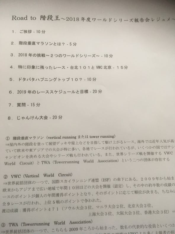 2019/03/01 12:14こんにちは。 階段王になる男、渡辺良治です。 ご報告が遅くなりましたが、2月11日に青梅永山ふれあいセンターにて2018年の報告会を行いました。 26名の方にご参加いただき無事に開催でき、ホッとしています。 報告会の後は坂道を使ったジャンピング練習や激坂ダッシュのミニ練習会も行い普段の自分の練習を体験していただきました。 報告会ではこれまでレポートでご報告してきた去年の海外遠征の中身をお話ししたほか、2019年シーズンの抱負もお話しさせていただきました。 今年は昨年以上にレッドブル400にも参加するなど活動の幅を広げたいと思います。 また、階段王になるためのステップとしてまずはVWCで年間ランキング2位を獲得するのが今年の一番大きな目標です。 そのために今年は昨年以上に遠征費用が必要になってくるのでまた新たにクラウドファンディングを行うことになるかと思いますが、その際はまたみなさんにご協力いただけると大変嬉しいです。 そして最後にクラウドファンディングにご協力いただいたみなさんに大事なご報告をさせていただきます。今回のクラウドファンディング全体の収支報告です。 少々見えにくくて申し訳ないのですが、以上のようになりました。 レシートが一部保存できていないものがありますが、現地での交通費や食費、リターンに使ったお土産代などを雑費として計上し、50万円使用させていただきました。 ですので、余った16,260円に関しては次年度の海外遠征費用として使わせていただきます。 去年、あれだけ海外の階段垂直マラソンのレースに参加し好成績を収められたのも皆さんの支えがあったからなのだと再確認しました。 本当に本当にありがとうございます!! 感謝の思いをうまく言葉にして伝えきれないのが歯がゆいですが、とにかくここまで来たら真の階段王になるためにあらゆる面で努力をして、皆さんの声援にこたえたいと思います。 こちらでのレポートはこれが最後になりますが、これからも引き続き 見守っていただけると励みになりますm(__)m 「階段王に、俺はなる!!」 by 渡辺良治 もっと見る