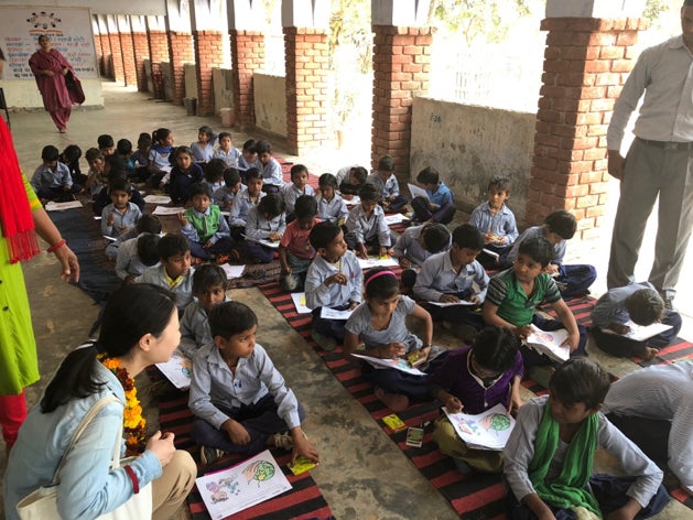 ハリアナ州の小学校にて。絵を書くことを通して、水の大切さを知る授業。年少生は塗り絵、四年生以上は水を題材に自由に絵を描いてもらいました。