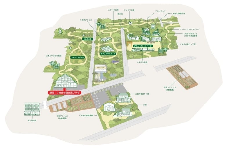 中には木陰の気持ちいいウッドデッキとベンチがあるカフェテリアパークや元気に体を動かせるアスレチックに、くぬぎ号(ミニSL)とN700系(ミニ新幹線)が走っているやまゆり鉄道など楽しいスポットが盛りだくさんです!