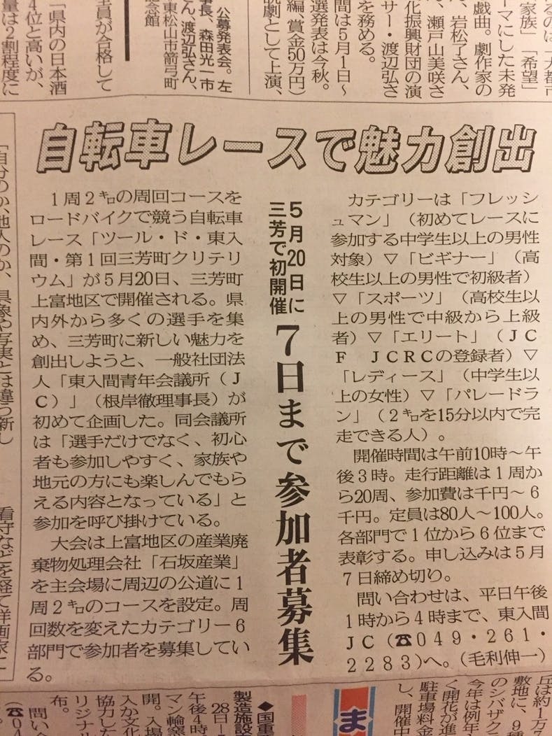 大会概要 大会名 ツール・ド・東入間 第1回 三芳町クリテリウム 兼JCRC特別戦 開催日 2018年5月20日(日曜日) エントリー受付 ~2018年5月7日(予定) 会場 石坂産業株式会社 埼玉県入間郡三芳町上富1589−2 主催 一般社団法人東入間青年会議所 協力 三芳町 一般社団法人埼玉県自転車競技連盟 一般社団法人日本サイクルレーシングクラブ協会 石坂産業株式会社 合同会社LinkTOHOKU 株式会社BAO 三芳町教育委員会 後援 富士見市ふじみ野市 富士見市教育委員会ふじみ野市教育委員会 青年が地域の活性化を目指す地域初の自転車レースイベント!! 是非応援を宜しくお願いいたします!!