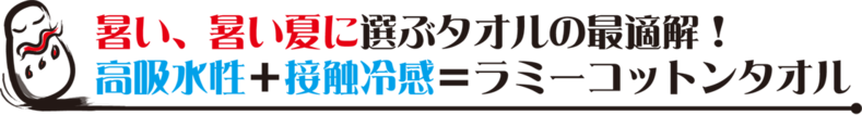 となります。暖かさが特長のウールが低く次にコットン、最も高い値がラミーとなってます。さらっと水分を取ってくれて、生暖かい感触にならないからラミーコットンタオルは夏に最適な涼しさ満点のタオルと言えるのです。
