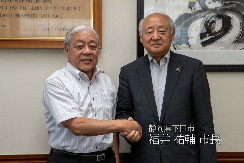 こちらのプロジェクトの発端は、下田市の福井市長が、商店街活性をテーマにしたNHKの番組に出演した島田憲一へ一本の電話を入れ、下田の地で島田の講演が実現されたことに始まります。その「始まりの始まり」へ立ち返ると共に、官民一丸となってプロジェクトを成功させるべく、福井市長へご挨拶に伺いました。